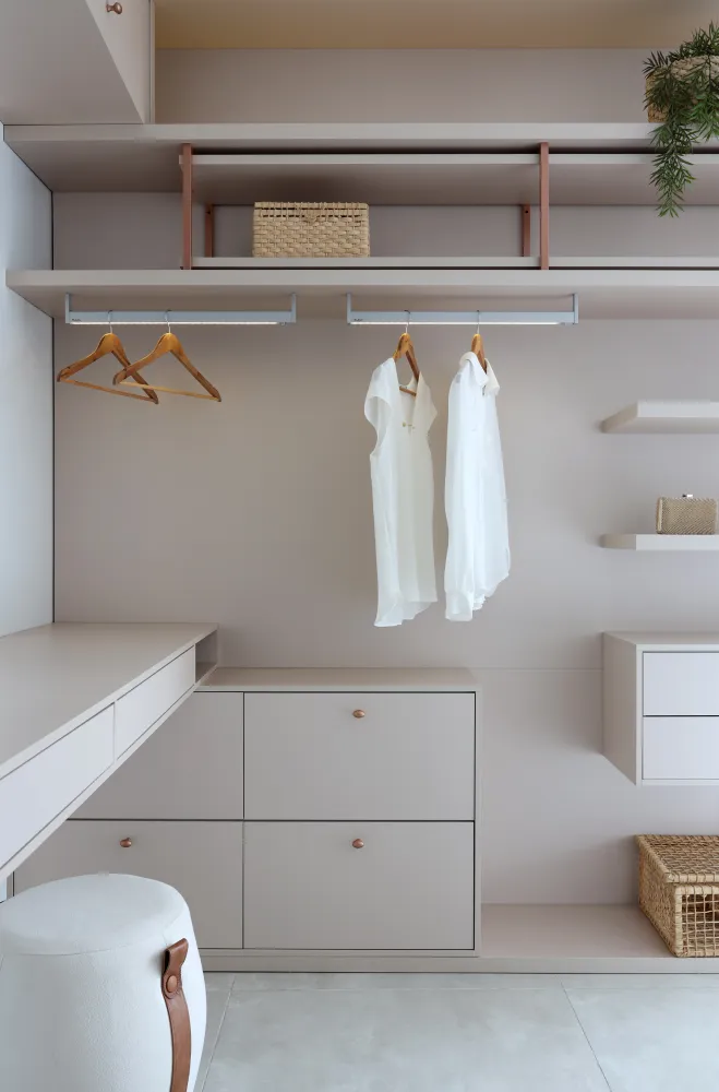 Móveis planejados podem incluir armários compactos que oferecem armazenamento sem ocupar muito espaço.